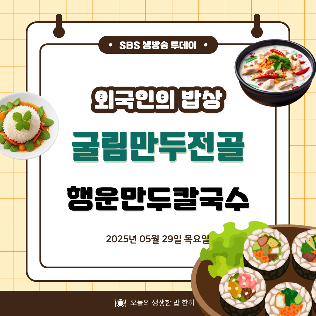 안녕하세요. 2025년 5월 29일 목요일 오늘 방영한 SBS 생방송 투데이 3779회 방영 정보 안내드립니다. 외국인의 밥상 코너에 소개된 일본 새댁 마이가 반한 굴림만두전골, 수원 행운만두칼국수의 위치, 메뉴, 후기 안내드리겠습니다.